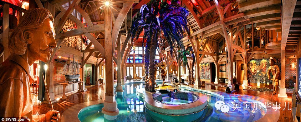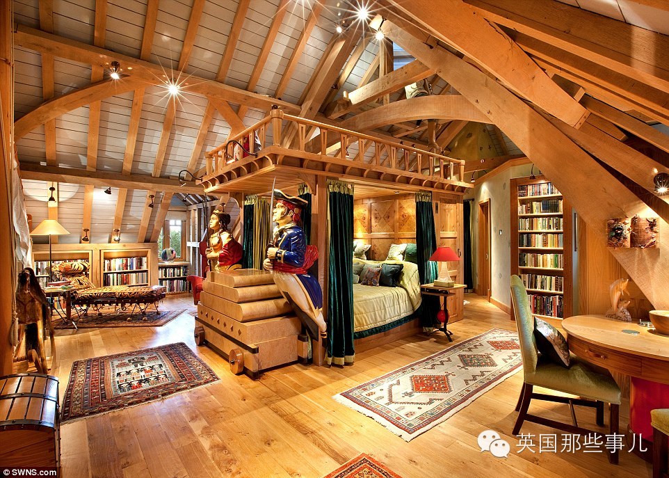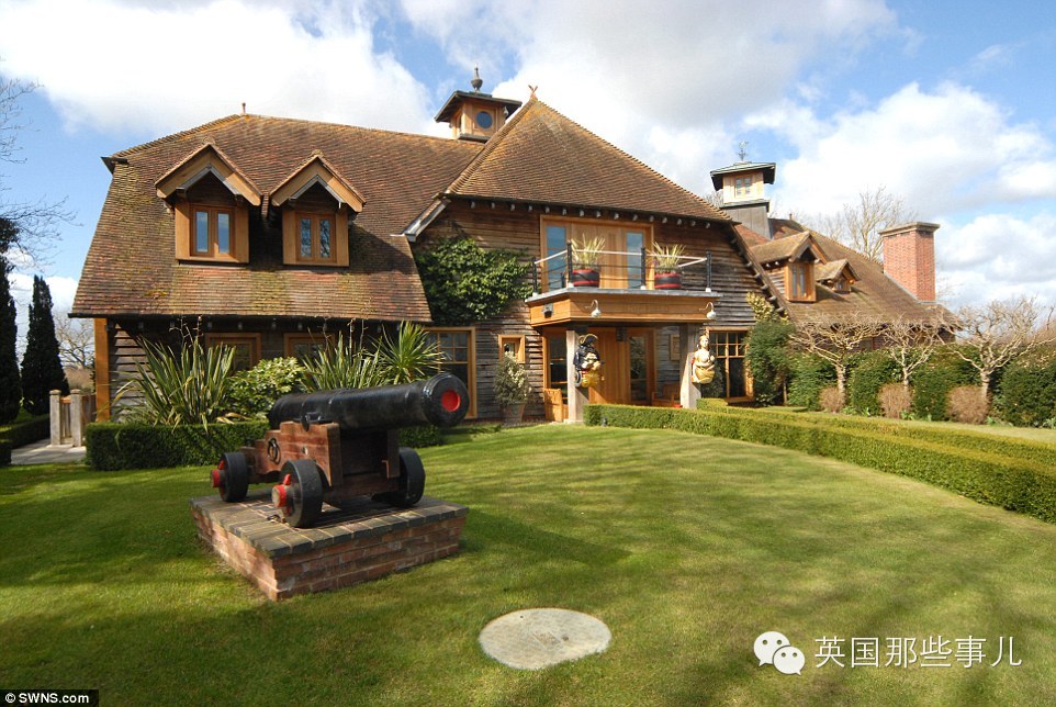 这是卧室!!! 这是正门外面的海盗大炮。。。。 这是厨房。。。。 各种器具。。。 好吧。。这屋子的前房主是一个比较有争议的巨富出版商Felix Dennis。 这是他仿照电影金银岛的风格打造了这么一套房子。。。 有池塘有棕榈树有乌鸦巢还有船。。。。。。 去年6月因为癌症离世之后。。 今年就放出来卖了。。