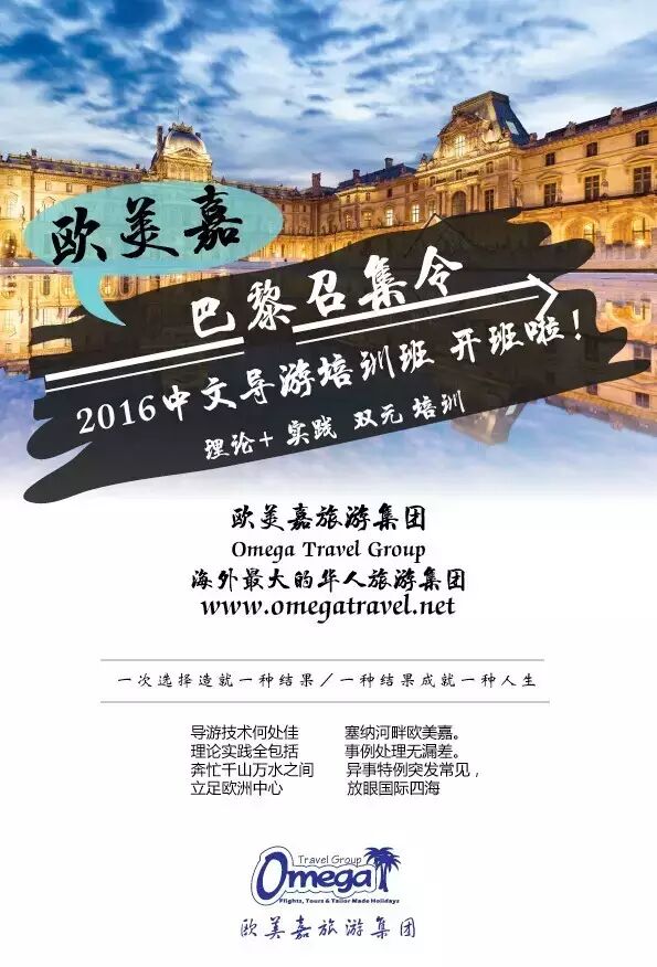你的带薪旅行梦, 从这里开始导游技术何处佳,塞纳河畔欧美嘉。 理论实践全包括,事例处理无漏差。 奔忙千山万水之间,异事特例突发常见, 专业培养方能让你笑对一切。 立足欧洲中心,放眼国际四海 欧美嘉(导游班)和你共同成长。 你可想把鉴阅风景当成职业?