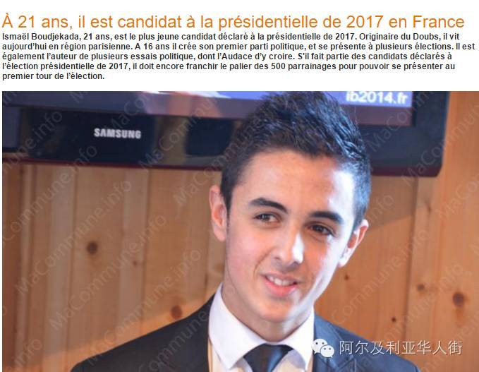 2.2016年10月25日http://www.dakaractu.com/ 人生开挂!21岁法国帅哥smael Boudjekada成为2017年法国大选最年轻的参选人。小哥16就创建了自己的政党,并多次参加选举。