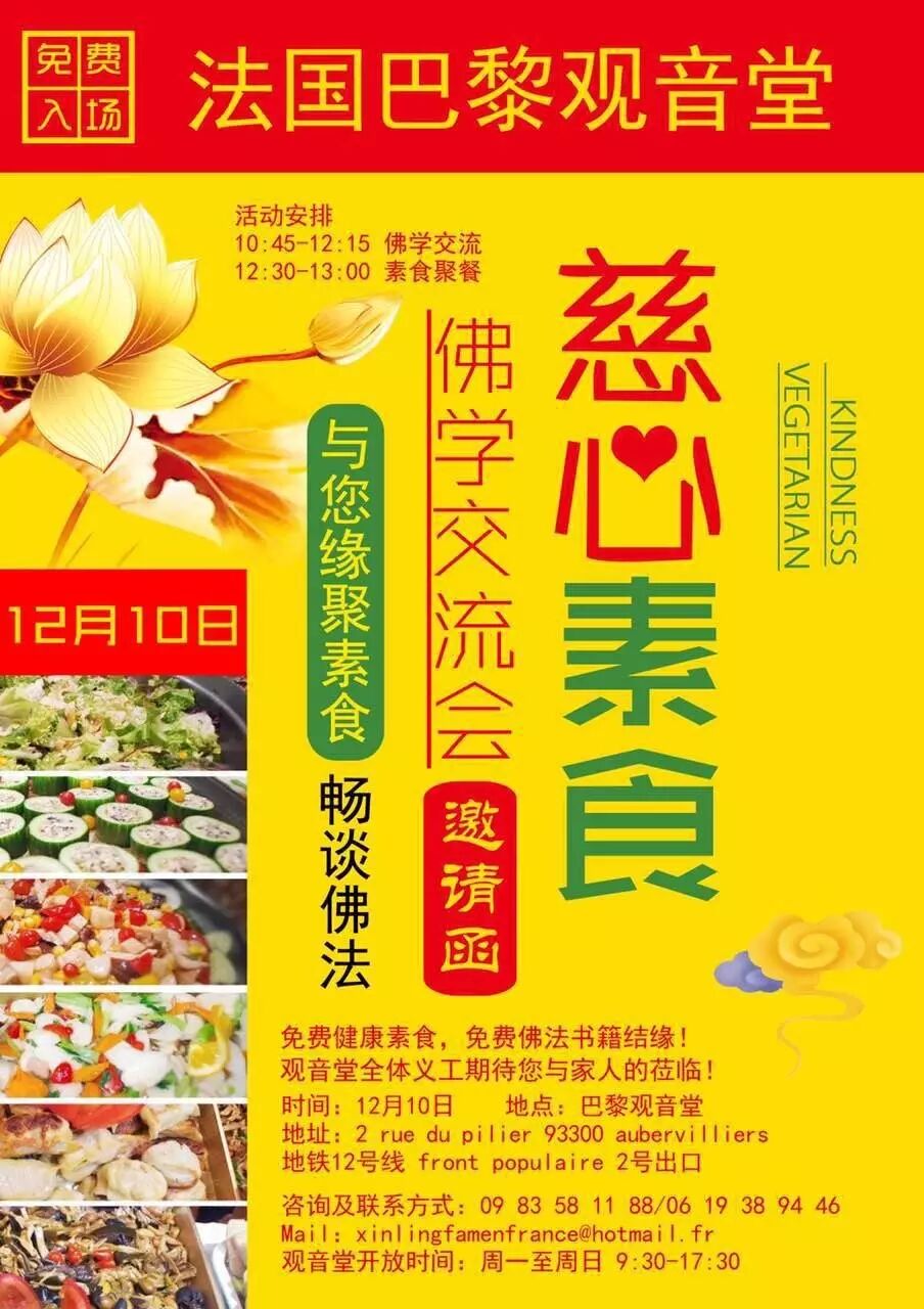 10:45-12:15 素食用餐 12:30-13:00 无需报名,免费入场,精彩不容错过。 活动地点 巴黎观音堂 地址:2 rue du pilier 93300 Aubervilliers