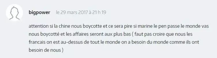 ▲ 小心如果中国抵制我们的产品就更糟了,如果勒庞上台,全世界都要抵制我们了,商业就要降到新低点了(不要以为我们法国人比全世界人都高明,我们需要全世界就像他们需要我们一样)