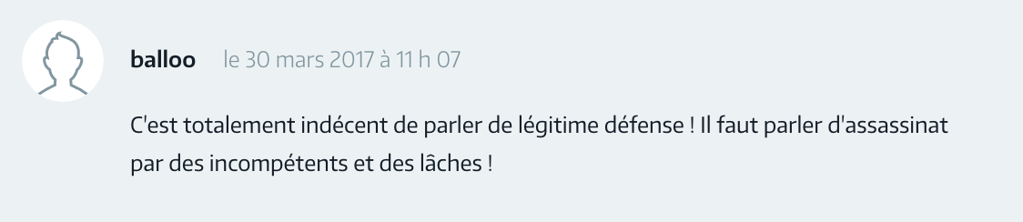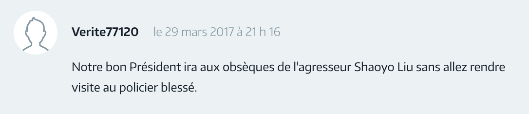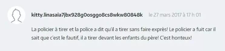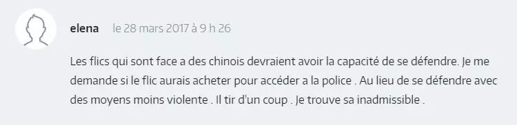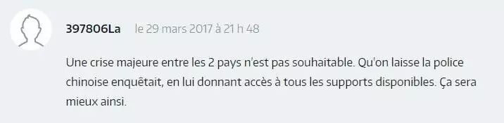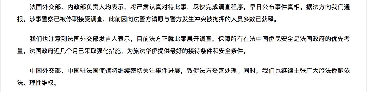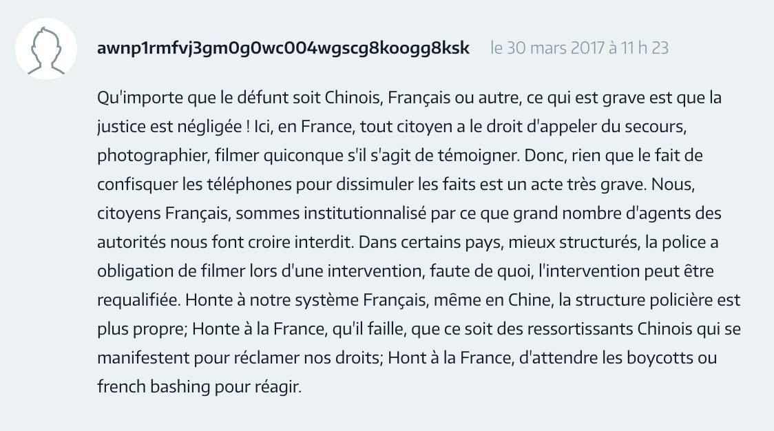 ▲ 死者无论是中国人也好,法国人还是其他国家的人的也好。重要的是,正义被忽略了!现在,在法国,每一个公民都有寻求救助,拍照,录像以作为证据的权利。所以(警方)没收手机,并隐瞒的事实是一个非常严重的行为。而我们,法国居民,被这些大量权力机构洗脑的结果让我们觉得这样是应该被禁止的。而组织得更好的一些国家,警察有义务拍摄事件真相,如果没有拍摄的话,警察的干预可以被重新定性。耻辱啊,法国的(警察)制度!哪怕在中国,警方的执法也比法国干净。耻辱啊,法国!让居住在法国的中国公民来抗议,为我们来争取权益。耻辱啊,法国!要等到被抵制了才会有反应。