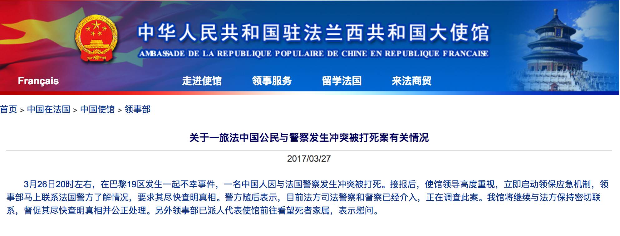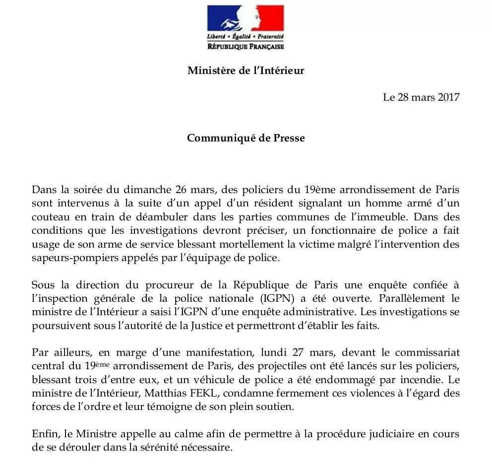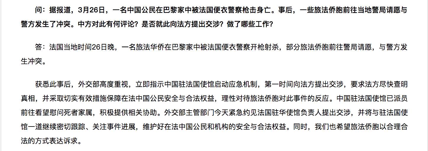 3月28日中国外交部华春莹在记者例会上就此案件发表讲话法国内政部发表公开申明,宣布内政部已委托IGPN(Inspection Generale de la police nationale)机构将对26日案件中警察的执法行为进行调查。同时,内政部表示27日的游行活动,有人向警察投掷抛射物,同时有一辆警车被烧。内政部长对此暴力行为表示谴责。晚上20点,华人群体在19区警察局门口进行第二次悼念示威活动,期间高喊抗议口号“Police, Assassin!(警察,杀人犯!)”、“On demande justice(我们要正义)”等等,本次集会参加人数据估计多达500人。抗议活动一直和平持续到晚上23点左右,23点后有媒体报道称发生少数抗议者向警察投掷物品,警察用催泪瓦斯弹驱散人群。两天共有45名抗议者,其中8名未成年抗议者被警方拘捕。