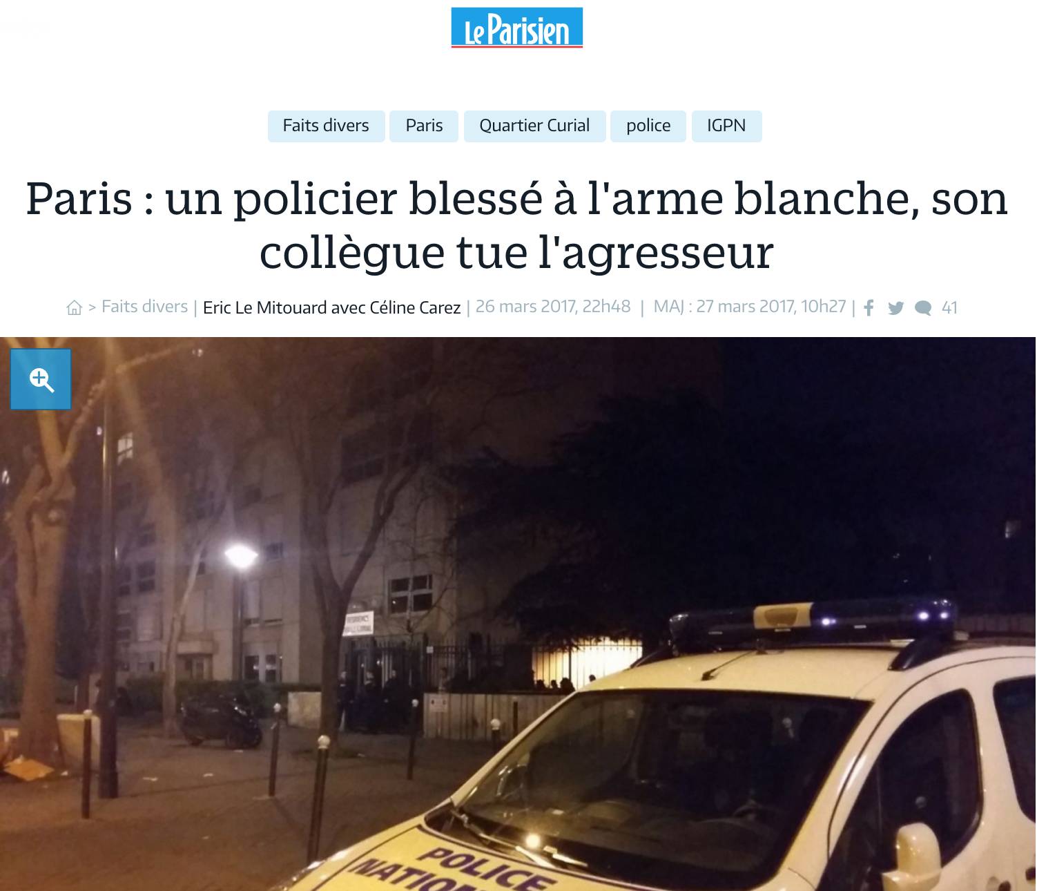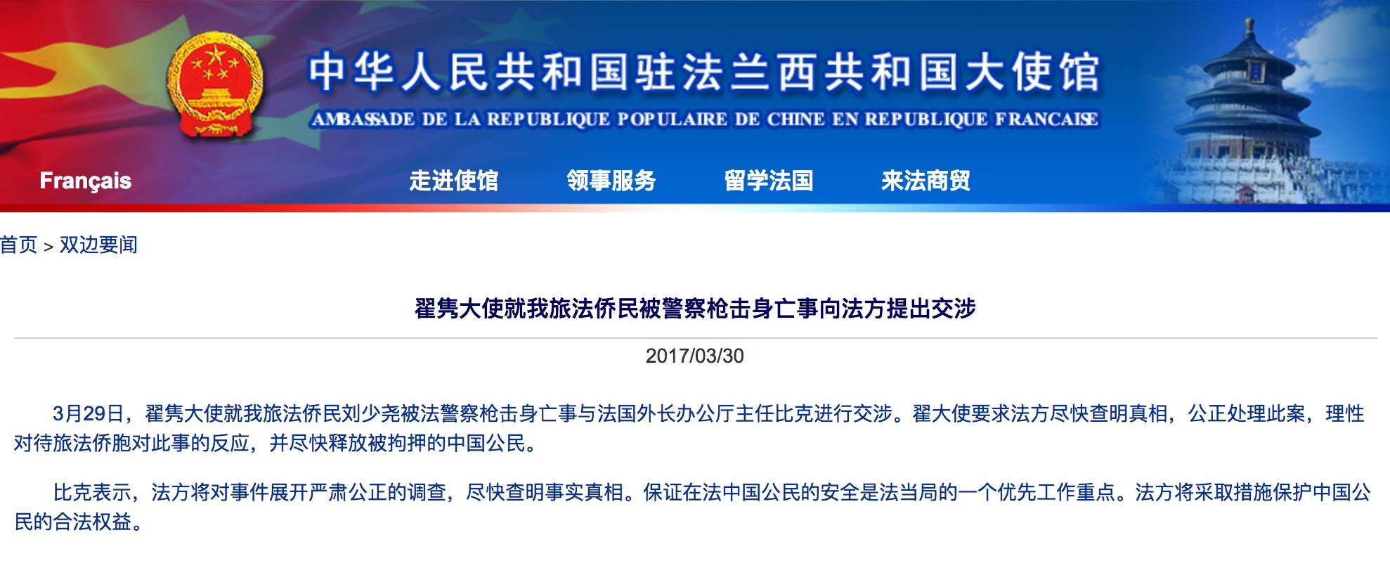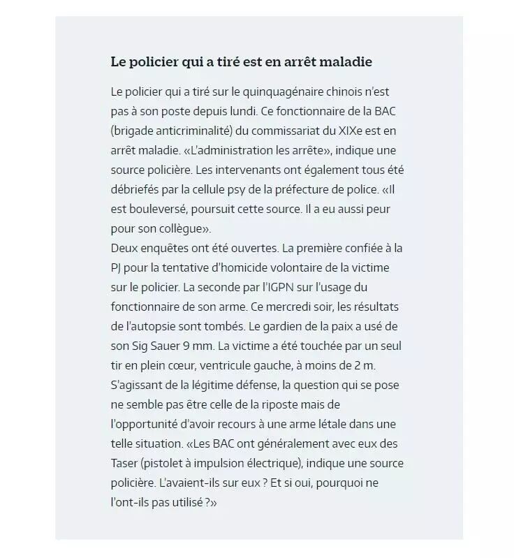 3月26日晚20时许,案件发生22时许,法媒《Le Parisien》报道此事件,标题为《Paris : un policier blessé à l'arme blanche, son collègue tue l'agresseur》单方叙述了警方提供的案情:警方接邻居举报华人受害者家有异常声音,便前往华人受害者家调查,华人受害者用剪刀攻击警察,导致其在家中被射杀。警方表示警员在受到到两次剪刀攻击以后在自卫的状况下(un cadre de légitime défense)开枪射击,同时声称受害人有酗酒、家庭暴力和精神病史。
