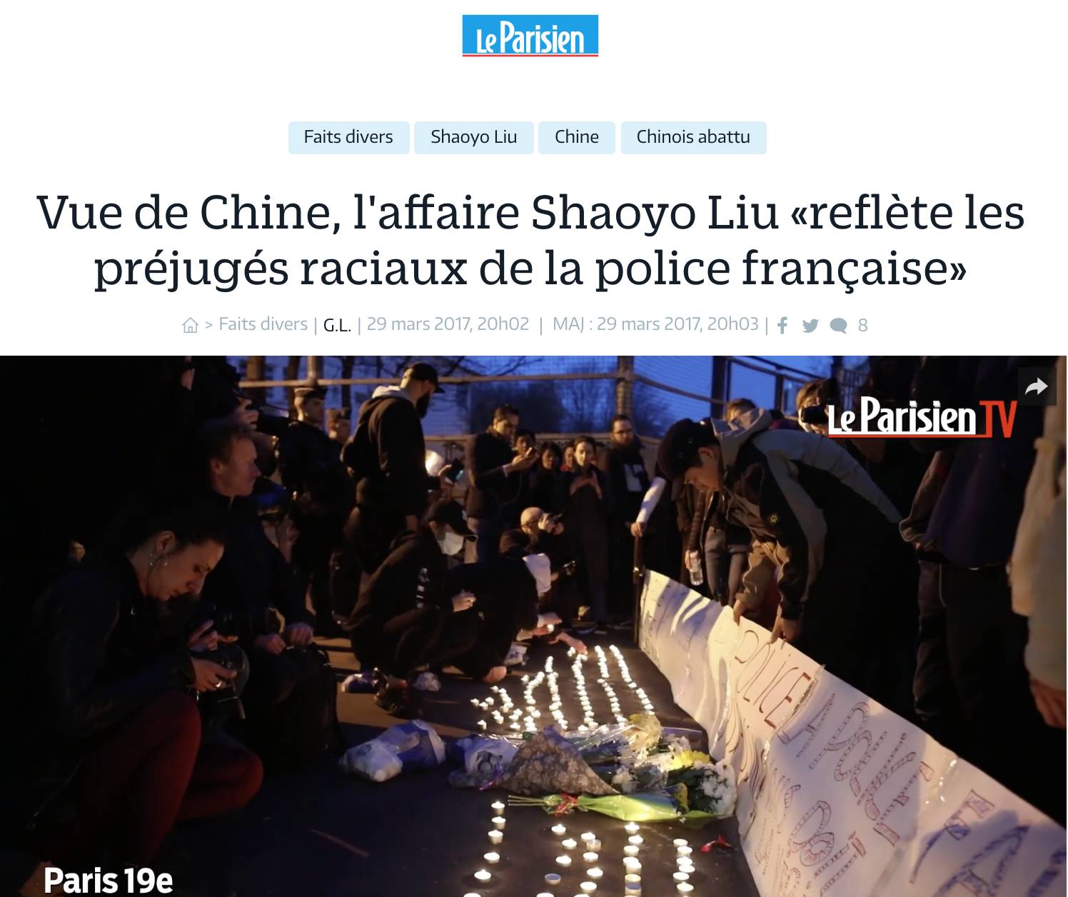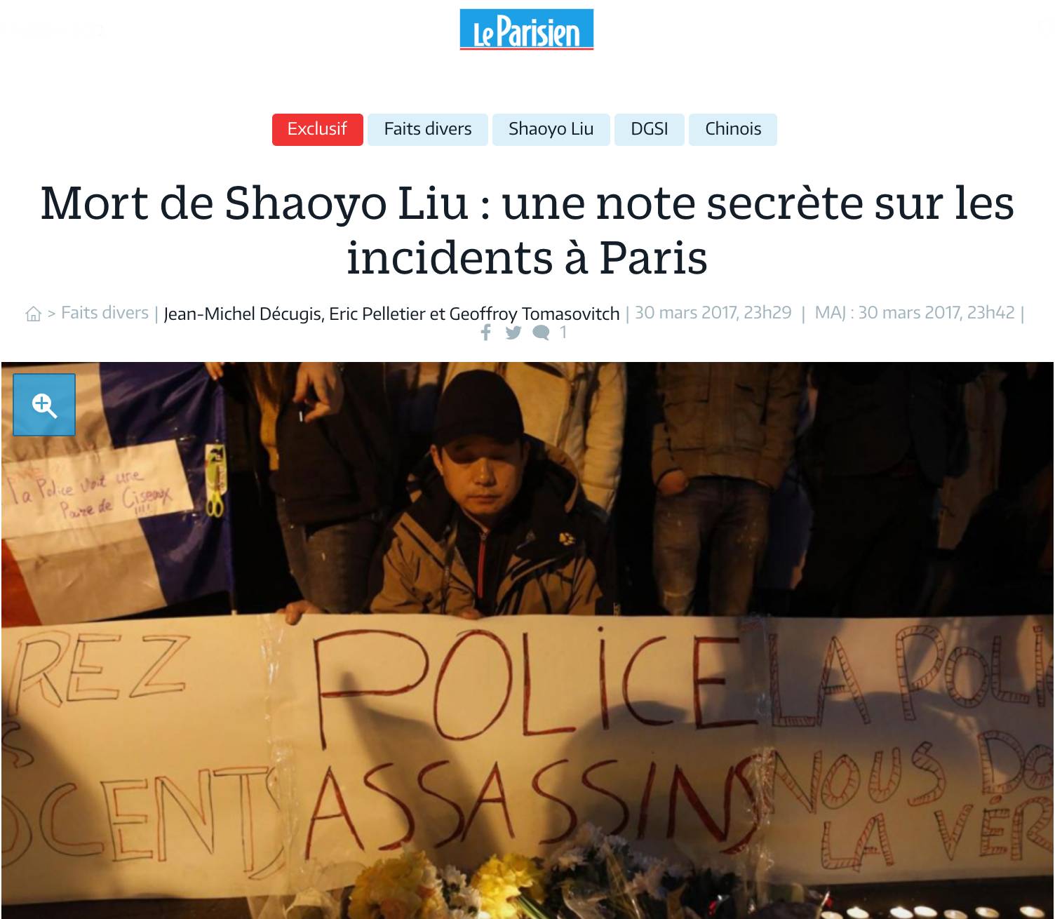 3月27日凌晨左右时分相继有关于此案件的文字在各个微信群中被转发,案件有了受害家属供词,从而暴露诸多疑点。更多媒体跟踪报道此事,重新比较了警方与受害家属的两方供词。受害者女儿表示:便衣警察在敲门的时候,受害人前去查看,因为疑心不愿意开门。因为刚刚正在厨房杀鱼,因此手上拿着杀鱼的剪刀。警察敲门未果后便强行破门而入后,没有任何警告便向受害人开枪,瞬间受害人便倒在了血泊中。中国驻法大使馆官方网站上公布《关于一旅法中国公民与警察发生冲突被打死案有关情况》一文,使馆要求警方查明真相的态度,以及告示法国司法部门已经介入调查此案。留法华人微信朋友圈及微信群中,关于此案件的微信文持续发酵。死者家属的口供引发民众情绪激烈。当晚20点,约150在法华人自发组织,在19区警察局门口进行悼念和抗议活动。22点左右,在警察局门口的悼念集会民众与警察发生冲突。据媒体报道,有一辆警车被烧,警察用催泪瓦斯弹以及警棍驱赶民众,并拘捕了35名参与者。
