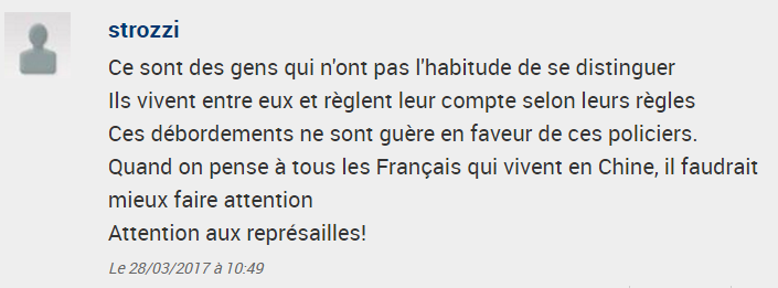 [size=1em]▲ 这都是些没有习惯区别(违法行为)的人,他们(中国人)只和自己人生活,遵守他们自己的规则。这些人违法时很少考虑警察。我想到所有住在中国的所有法国人们,最好多注意,小心报复!