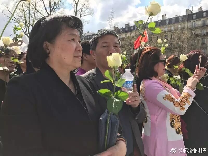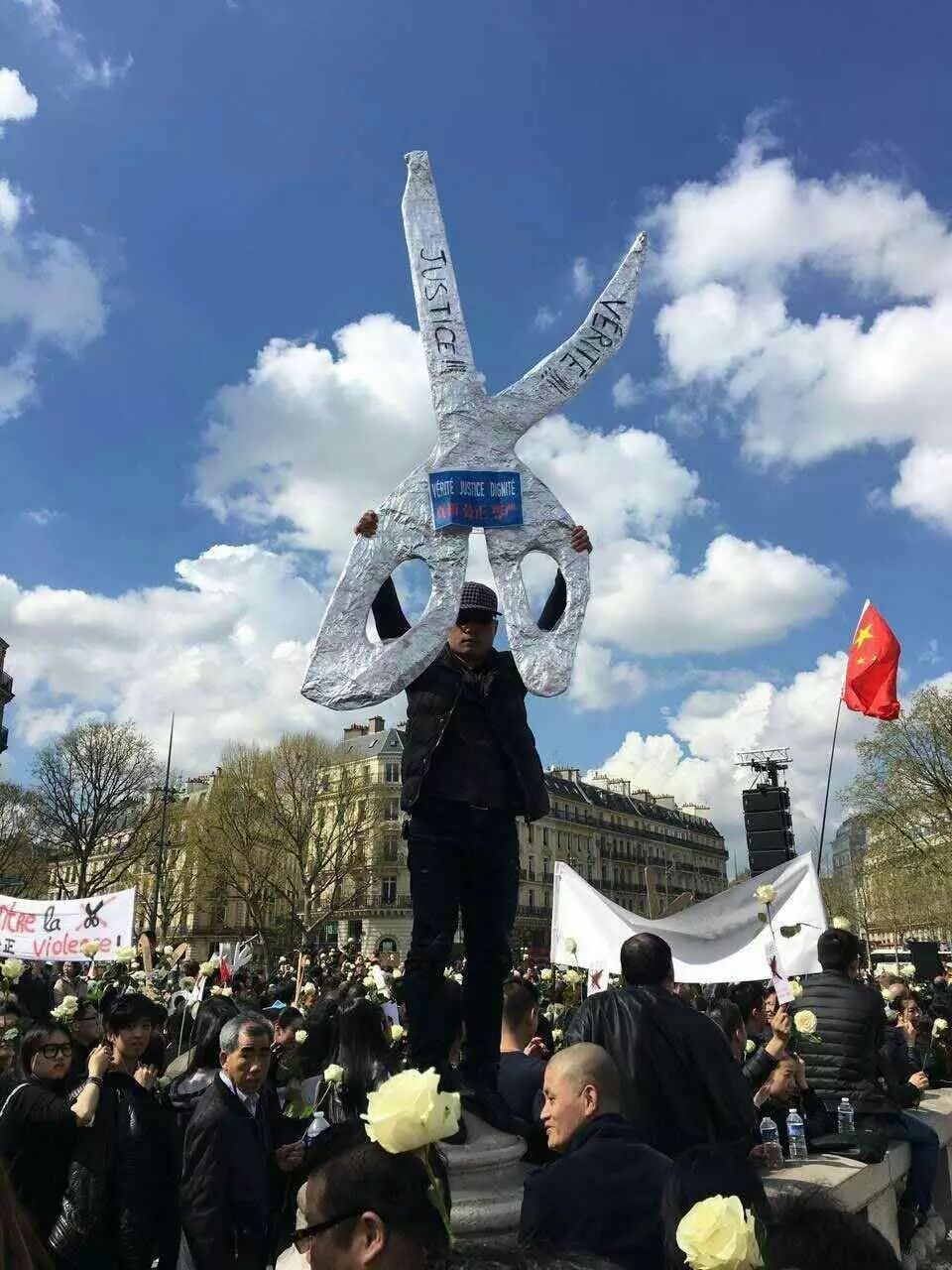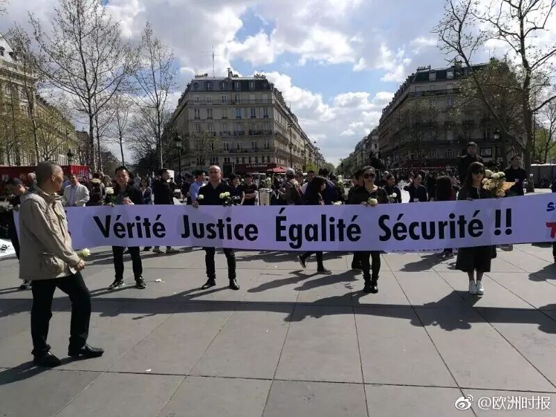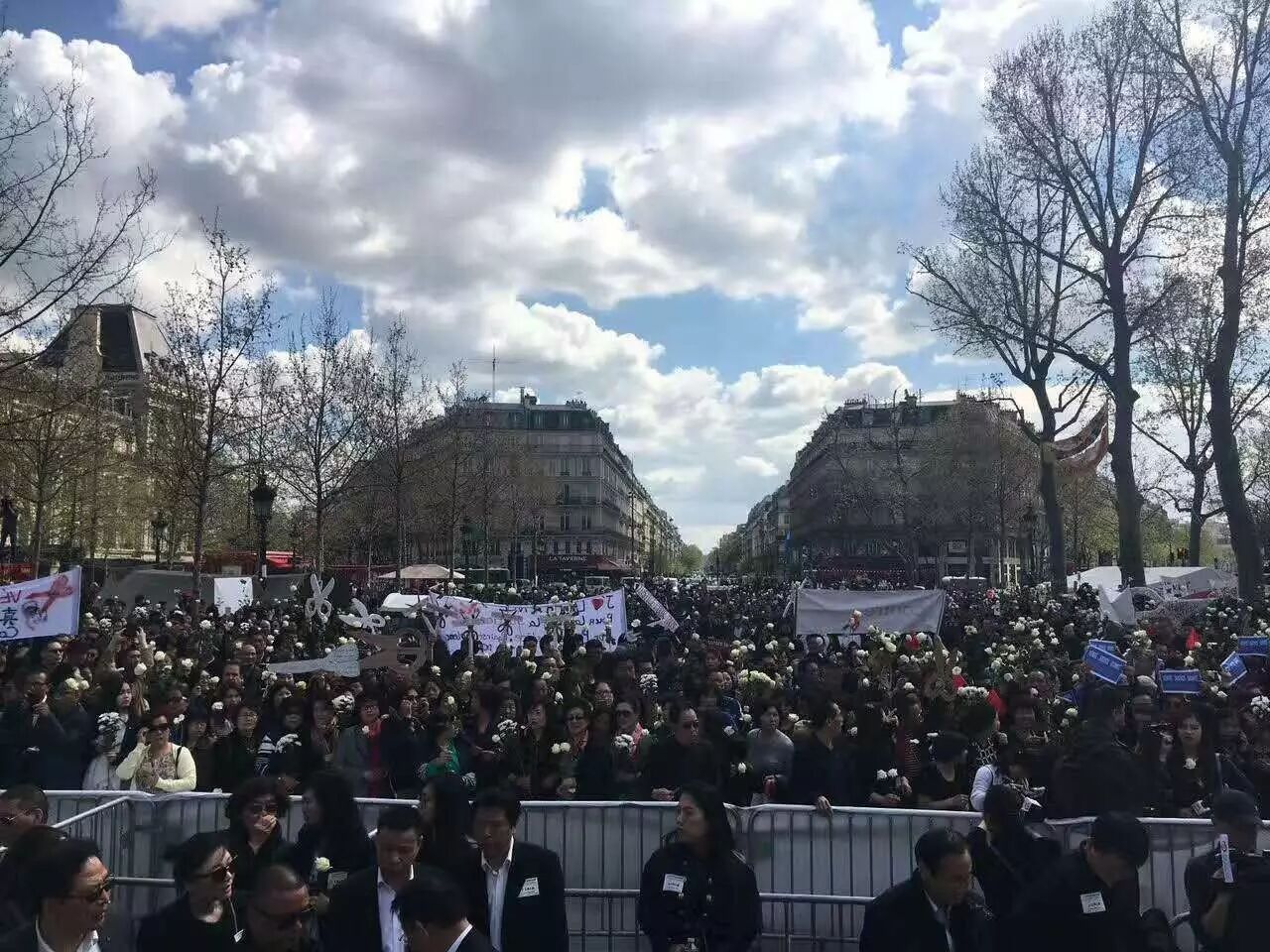 法国当地时间4月2日下午,在获得法国政府预先批准的情况下,数千位华人在巴黎共和广场举行合法集会,悼念被法国警察枪击致死的旅法侨胞。