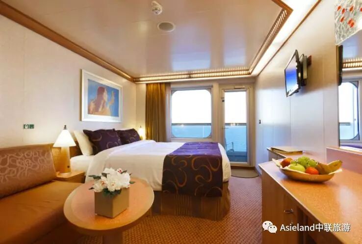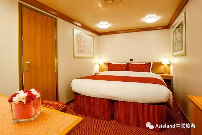 内舱房设施:2张标准单人床可合并成大号床;吹风机、迷你酒吧(收费)、衣橱、淋浴、电视、电话、空调。