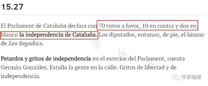 加泰罗尼亚地方议会本周五西班牙时间15点27分以70票赞成,10票反对,2票弃权通过议案,宣布从西班牙独立!