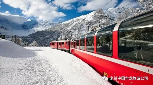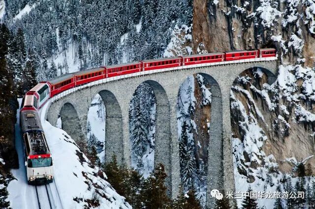 壮观的高架桥用粗凿的石块建成,周围是无边无际的群山,与之相伴的是高大挺拔的阿尔卑斯山冷杉和陡峭的岩壁。高架桥上,一列红色的小火车嘎嚓嘎嚓地缓慢行驶,这就是伯尔尼纳快车。