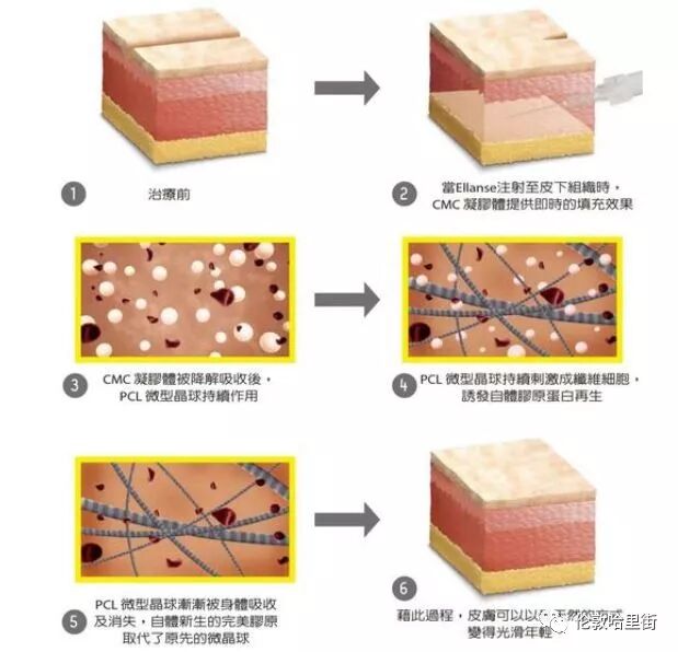 而CMC凝胶载体内包覆着 PCL,注射至皮下肌肤后,PCL随着注入的CMC凝胶均匀的浮起,平均分布在各层,撑起因老化流失、坍塌的组织,能暂时支撑凹陷的地方,当下即可改善皱纹、凹陷,随后PCL会刺激胶原蛋白新生,取代被吸收的凝胶载体积,让老化的肌肤组织能重新建立,抚平皱纹、凹陷并拉提紧致。最终看到的是皮肤自已长的胶原蛋白效果。