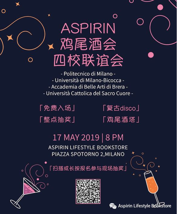由米兰理工大学学联主办,同时邀请到比可卡大学学联,布雷拉美术学院学联以及圣心天主教大学学联的初夏鸡尾酒会暨四校联谊会,将于5月17日周六晚8点空降米兰Aspirin Lifestyle Bookstore