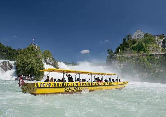 有着欧洲第一大瀑布称号的莱茵瀑布每年都吸引 着来自世界各地的游客前来参观,这里公交系统发达,可以 从瑞士其他城市,比如苏黎世、温特图尔等地直接坐火车抵 达。慕名而来的游客在这里不但可以欣赏到瀑布的自然景观,还可 以看到瀑布边上的两座城堡,分别是崂芬城堡(Schloss Laufen)和 施洛斯利沃特城堡(Schlössli Wörth)。